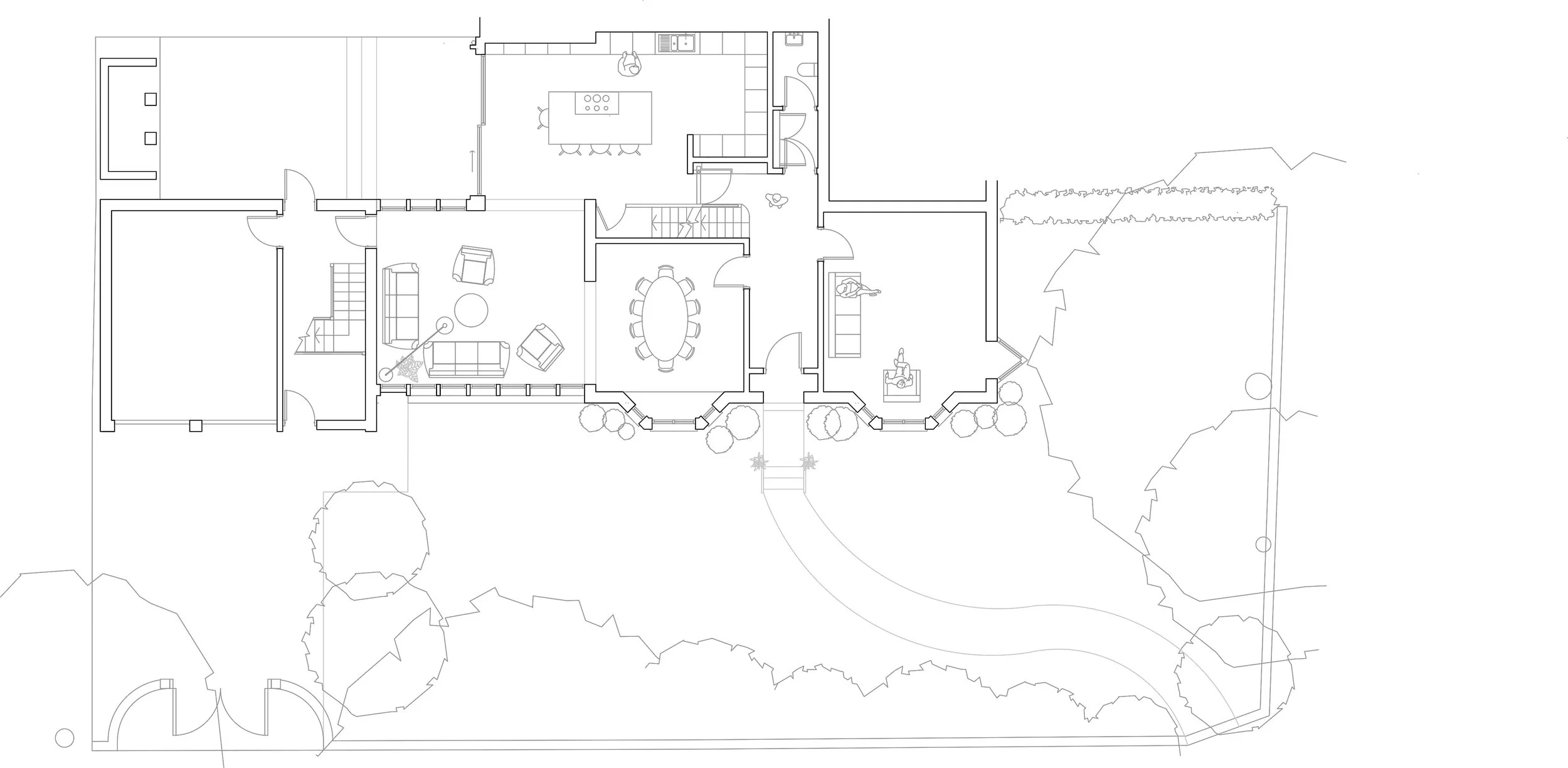 A key feature is the use of full-height glazed panels framed in natural timber, which provide strong visual permeability between interior and exterior spaces. This transparency enhances natural daylight within the extension and establishes a direct connection to the garden, softening the transition between built form and landscape.